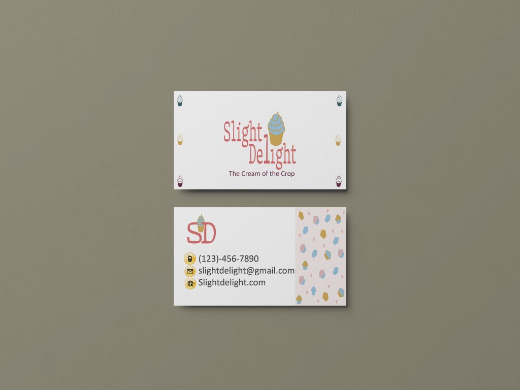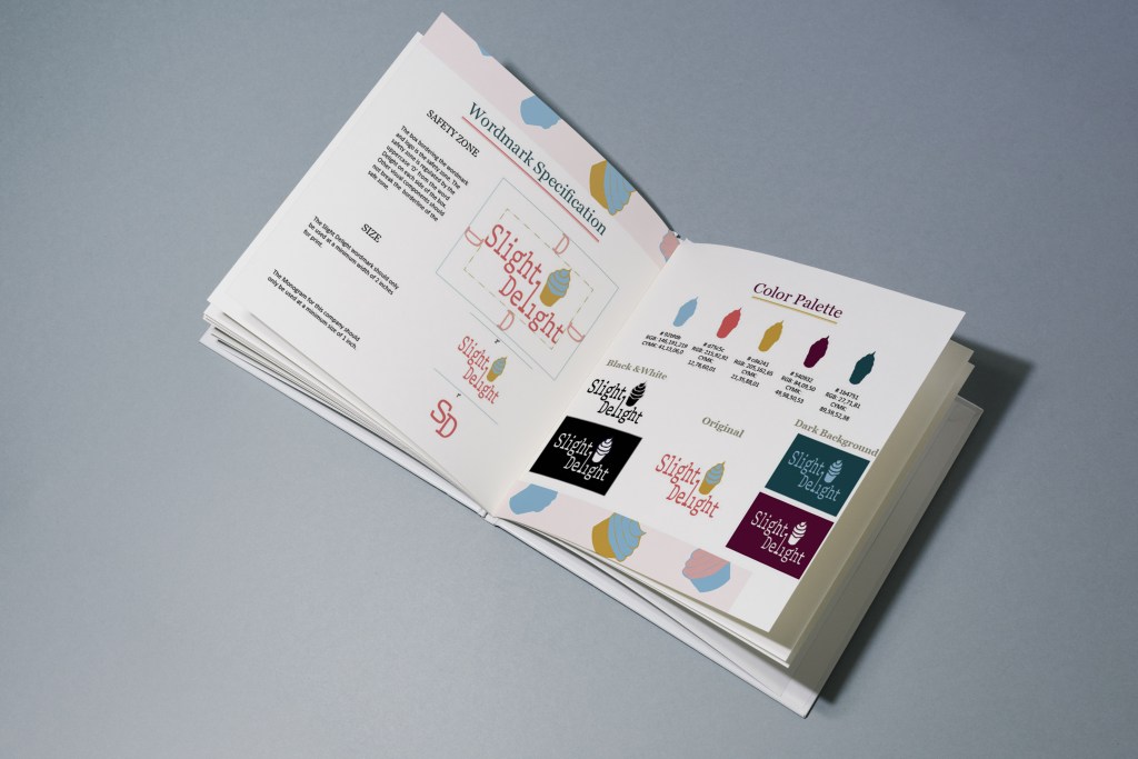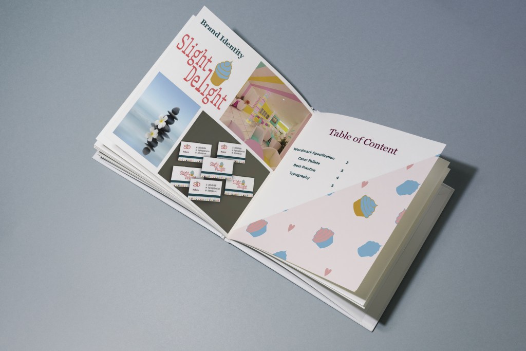 Slight Delight is a bakery specializing in baked goods. This project focused on creating a playful brand identity and guidelines for small businesses, which was challenging yet rewarding. I aimed to design a fun logo with bright colors to reflect the bakery’s joyful concept. The logo, featuring a cupcake in cool and warm colors, successfully embodies the brand’s playful spirit, appealing to both young customers and sweet enthusiasts alike.